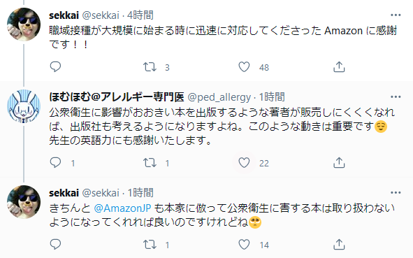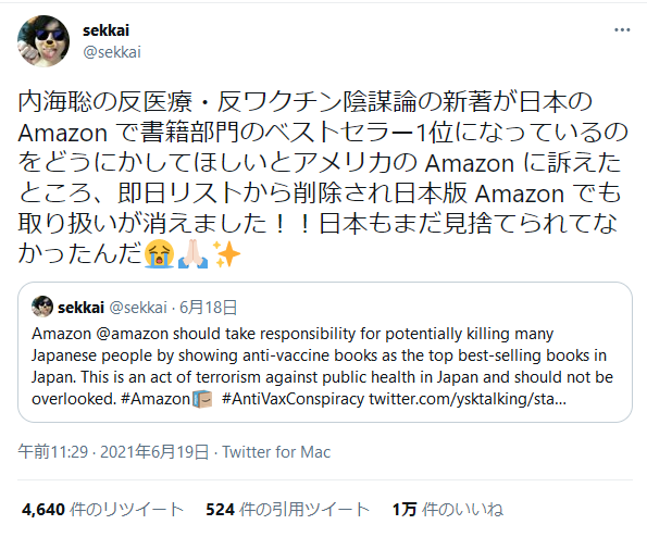 単に、この人がAmazonのツイッターアカウントに対して、「反ワクチン本をベストセラーとして表示するなど、日本の公衆衛生にとってのテロ」だと言っただけで、日本のAmazonから書籍が引き上げられ、それを自分の手柄のように言っているんですね。