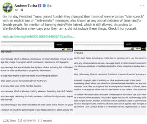トランプ氏がRumbleに参加した日である土曜日、この動画ホスティングプラットフォームは利用規約を変更し、「反ユダヤ主義 」や 「憎悪 」に満ちた投稿を禁止することにしました。
