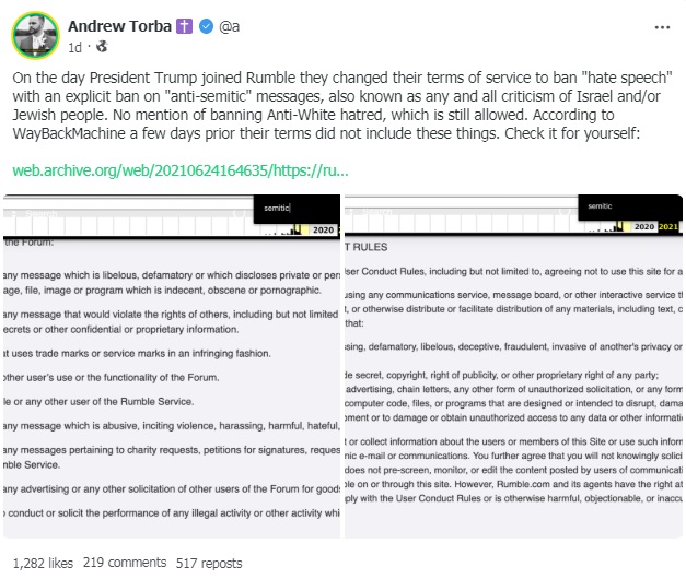 Trump Joins Rumble, Rumble Changes Terms Of Service to Ban ‘Anti-Semitic’ And ‘Hateful’ Speech