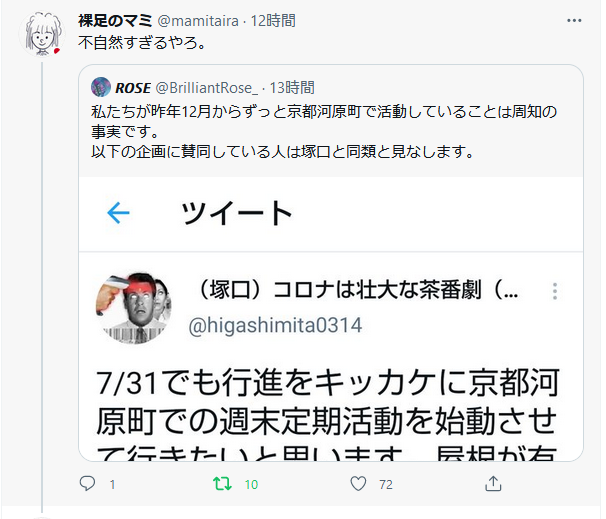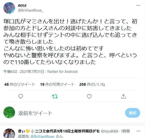 7月31日のことですが、ダブスタ塚口さんの批判をした京都グループ、特に裸足のマミさんをダブスタ塚口さんが攻撃しようとしたようです。