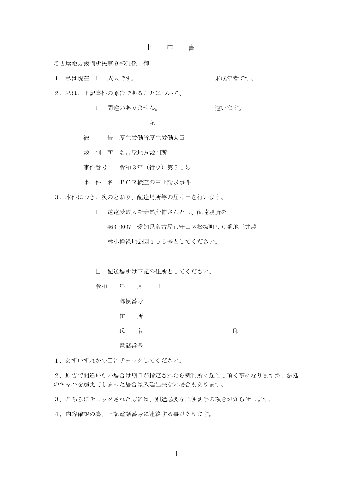 PCR差し止め訴訟原告の上申書になります。これをダウンロードして署名・捺印して、テラオ自動車まで郵送して下さい。思い切り拡散してください!宜しくお願いします!