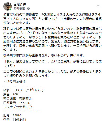 名古屋地裁の事務連絡で、PCR訴訟1472人分の訴訟費用は574万(1人約3900円)との事ですが、上申書の無い人は原告の資格がないとの事です。...