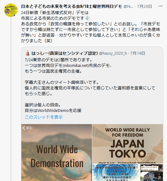 この件をどう見るかは読者に任せますが、実際に要請してきた政党とは、Kの率いるT党です。もちろん、こんな連中ともつきあいたくないですし、世界デモ東京でのT党の旗などお断りですが、個人として参加する分には構いません。しかし、連中は「それなら参加しない」と言ってきたのです。何を意図しているか明らかでしょう。ニコミ会アカウントが書いているように「本気じゃないのがわかった」んです。