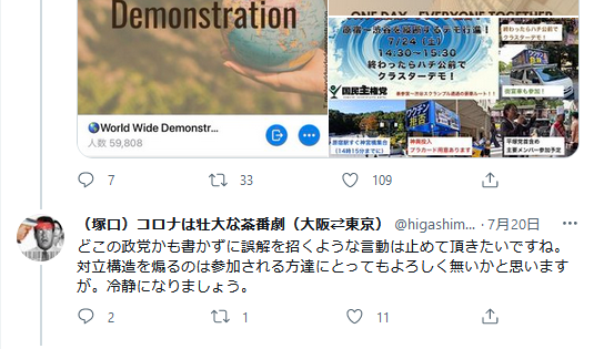 また、塚口は7月24日の14:30からのニコミ会の新宿デモの同時刻にぶつけて渋谷デモをアナウンスしていました。わざわざ世界デモを潰す意図があったことは明らかです。しかし、あまりに人が集まらず、中止を声明。その後に平塚側が継続し、主権党デモとして実行されたのです。我々は700名の参加者、主権党は50名程度でした。この経緯も上記動画の最後の方でわかります。