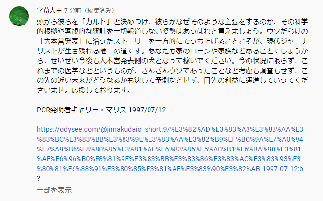 何しろ連中と来たら、学者や医師の異論さえ一切報道することなく、訴訟提起でさえも報道せず、世界中で起こっている大規模デモも一切報道せず、PCR発明者のキャリー・マリスがPCRについて何と言っていたかも、そもそもキャリー・マリスの名前さえ報道しないのです。さらに、現実に起こっているワクチン被害者の事実も報道しません。