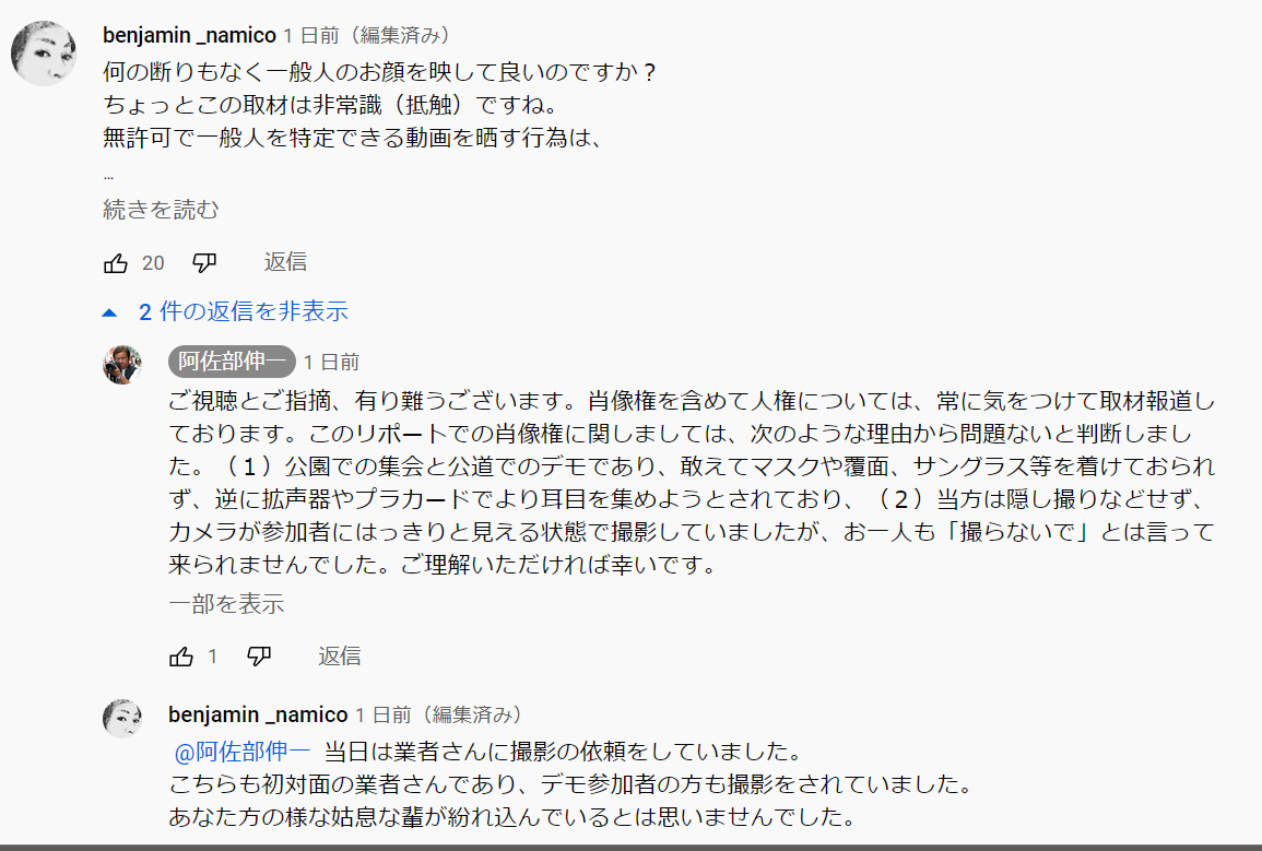 コメント中で、「撮影許可・取材許可を取っていないだろう?」という非難があり、それに対して阿佐部伸一さんは「問題無いはずだ」と強弁しています。