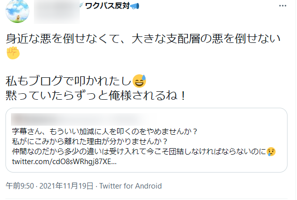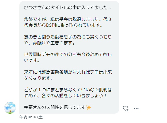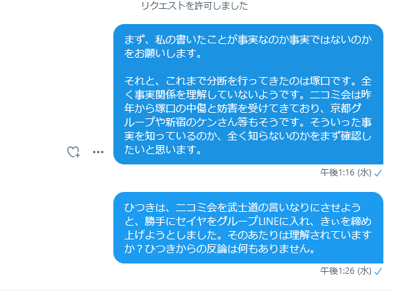 ところが、その後、ひつきは、メンバーでもなくデモの司会しかしていない榎本セイヤをニコミのグループLINEに勝手に入れ、当時メンバーで武士道シンパの粒あんと三人で、いわば武士道にニコミを屈服させようと、きぃを締め上げようとしたのです。