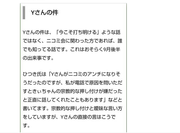 私は彼女の実名などは出さずにYとしか書いていません。が、当時ニコミ会に関わった者であれば誰でも知っている事実です。そして、私がこれを出した理由は、前代表のひつきがいかにウソつきであるかを示すためです。ところが、「プライバシーを侵害され」「ブログで叩かれた」としているのです。さらに、私がYと7/22に話した時は、私はYから何らの抗議も受けていないのです。