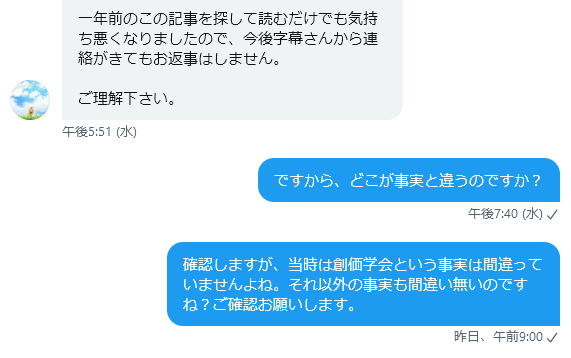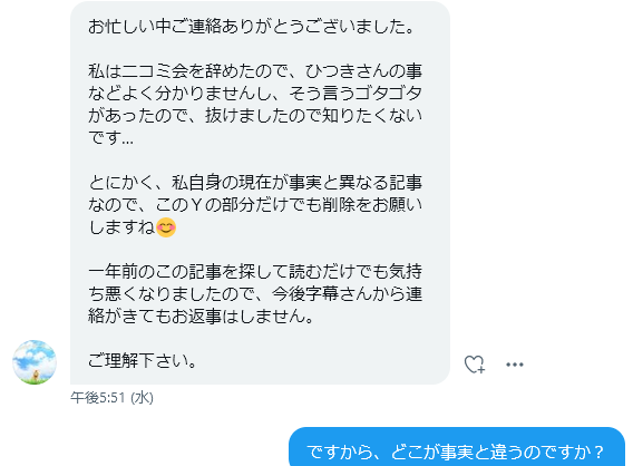 さらに、悪いことには、今回私はこれが事実なのかを彼女に確認しようとしていますが、それに対する返答はありません。都合が悪くなると無視を決め込んでいるのです。もし、事実ではないというのであれば、修正する用意もありますが、一切何の返答もありません。