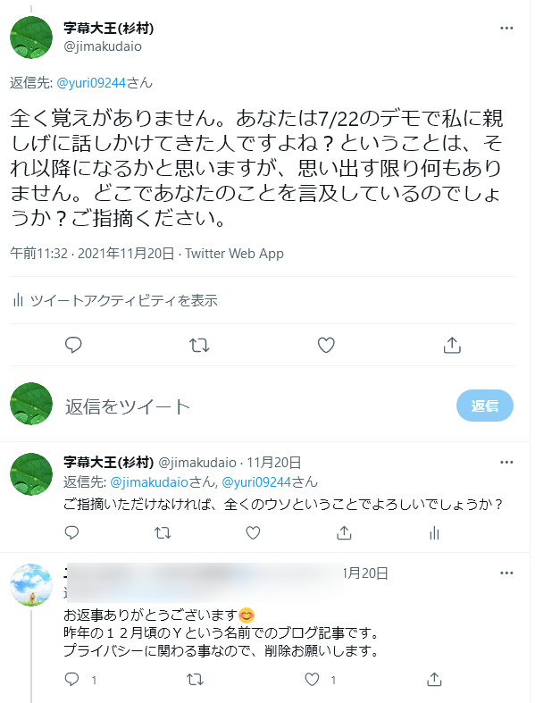 下側のツイートはお話にならないので、ここでは問題にしません。問題は上側のツイートです。「私もブログで叩かれたし」と言っていますが、私には全く覚えがなかったのです。この人のことは、今年の5月頃から顔を認識していると思います。7/22の他グループのデモの時には、彼女の方から親しげに話しかけてきました。。。ということは、それ以降に私が何かを書いたのだろうかと思うのですが、全く覚えがありません。一体何故彼女はこんなことを言うのだろうと思いました。