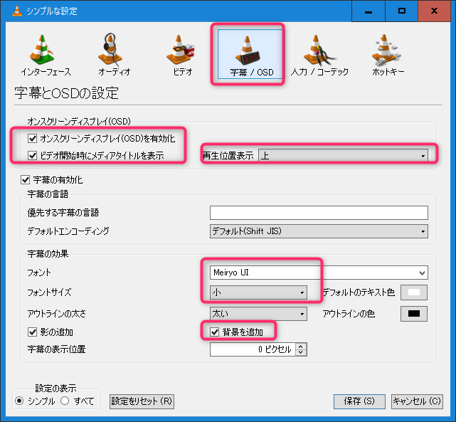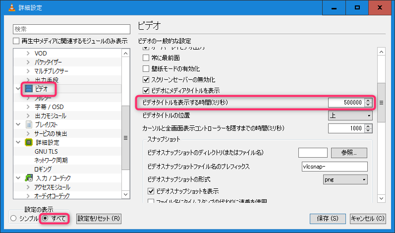 先の設定の左下の「設定の表示」を「すべて」にし、左側で「ビデオ」を選択し、「ビデオタイトルを表示する時間(ミリ秒)」を適当に長く設定します。ここでは500秒(5000000秒)に設定しています。