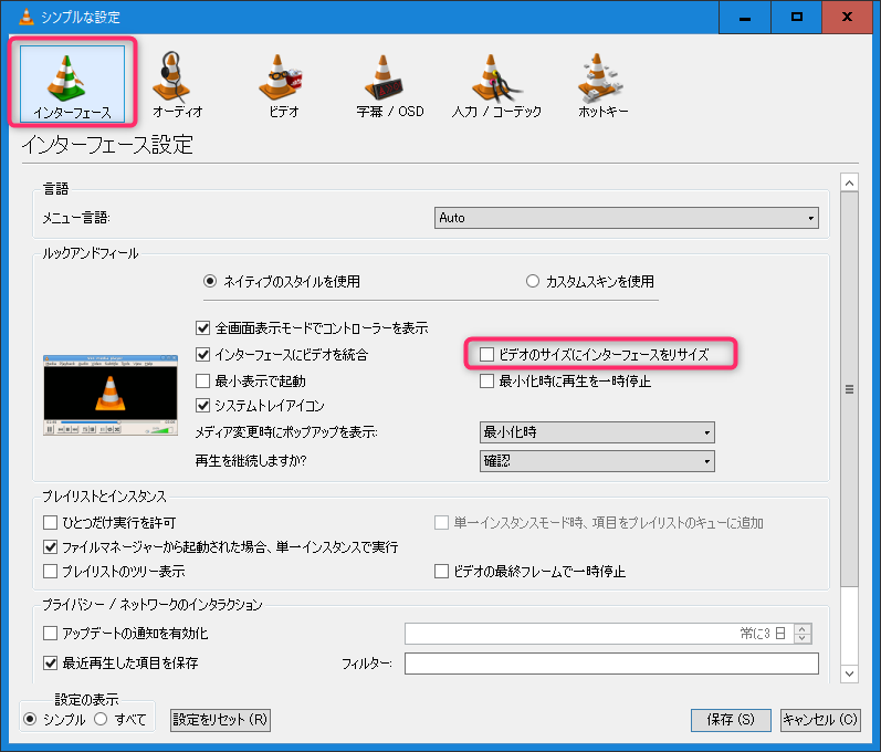 これは必ずしも必要無いのですが、インターフェース設定で、「ビデオのサイズにインターフェースをリサイズ」のチェックをOFFにします。これがONだと非常に使いづらいので。