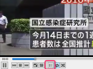 以下のボタンをON状態にしておきます。VLCは複数動画の「再生リスト」を保持しておけるので、最後の動画が終了すると、自動的に最初の動画の再生になります。