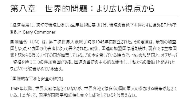 <!–8. Global Issues: The Wider Perspective–># 第八章 世界的問題:より広い視点から<!–“Economic development can proceed without a concomitant decrease in environmental quality if it is based on an appropriate, ecologically benign production technology.” Barry Commoner–>「経済発展は、適切で環境に優しい生産技術に基づけば、環境の質低下を伴わずに進めることができる」~Barry Commoner<!–The United Nations (UN) was founded in 1945 at the end of WWII; its Charter was signed by the representatives of 51 countries that became the first group of Member States. UN Membership has grown in the post-war years to the extent that it now includes virtually every country recognised to be a sovereign state. At the time of writing, there are 193 UN Member States and 2 Non-Member States with observer status. The original central mission of the UN is stated on the web page entitled What We Do to have been,–>国際連合(UN)は、第二次世界大戦終了時の1945年に設立された。その憲章は、最初の加盟国となった51カ国の代表者によって署名された。戦後、国連の加盟国は増え続け、現在では主権国家と認めらるほぼすべての国が加盟している。この本を書いている時点で、193の加盟国と、オブザーバー資格を持つ二つの非加盟国がある。国連の当初の中心的な使命は、「私たちの活動」と題されたウェブページに書かれている通り。<!–“…the maintenance of international peace and security”–>「国際的な平和と安全の維持」