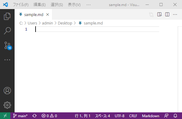 インストールした後は、適当に拡張子がmdのファイルを作成し、ダブルクリックすれば、Visual Studio Codeが起動して編集が可能になる。例えば、「sample.md」という空のファイルを作成して、それをダブルクリックする。こんな表示になる。