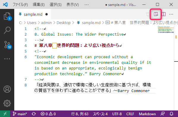 例えば、先の原稿をプレビューにかけると、以下の表示になる。原稿中では、英文・翻訳文は混ざった形になっているが、プレビューでは、英文が削除され、翻訳文のみが表示される。