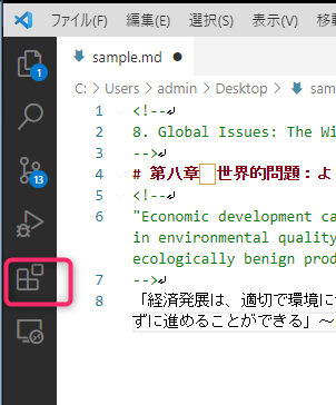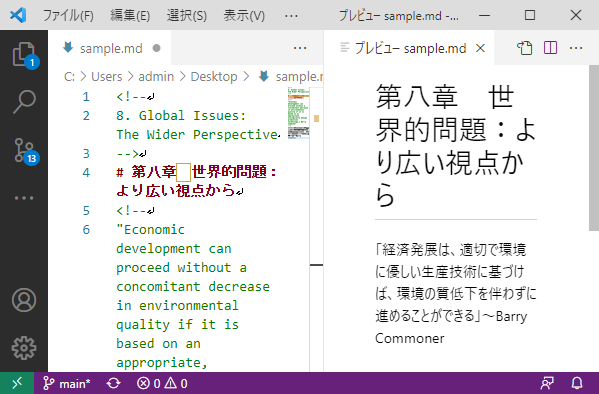 上のようなMarkdownテキストの編集には、「良くあるただのテキストエディタ」で十分可能だ。しかし、Markdown用の編集機能のあるエディタを使った方が何かと便利だし、先に示した「プレビュー」を適宜表示することができる。Markdown編集機能のあるエディタは、多数の種類があるのだが、最も簡単なのはマイクロソフトが無料で配布しているVisual Studio Codeというエディタだ。本当は使いたくも無いのだが、他を試してみるのが面倒なのでこれにしている。