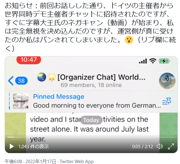 In WWD 4.0 Sep 18th Hiroshima did a demonstration by his order. There’s a lady in Hiroshima who are obeying any order from him. I think they’re forming some kind of a cult. I explained her how he was hindering other groups. But she didn’t listen.