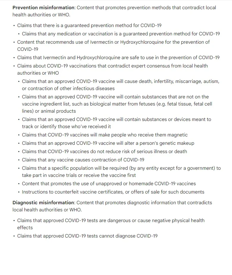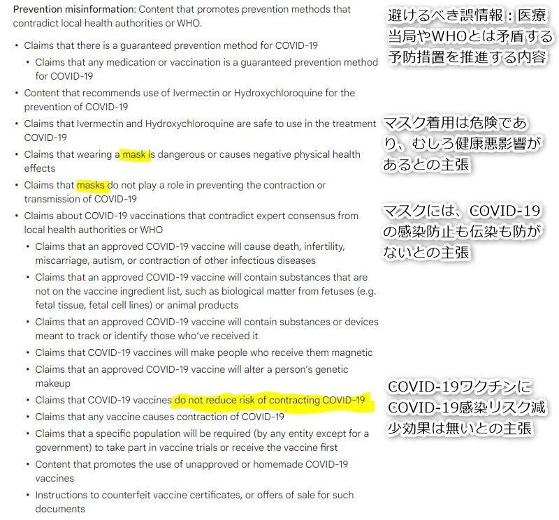 以下は、2022年1月からのCOVID disinformationに関するYouTubeのルールである。