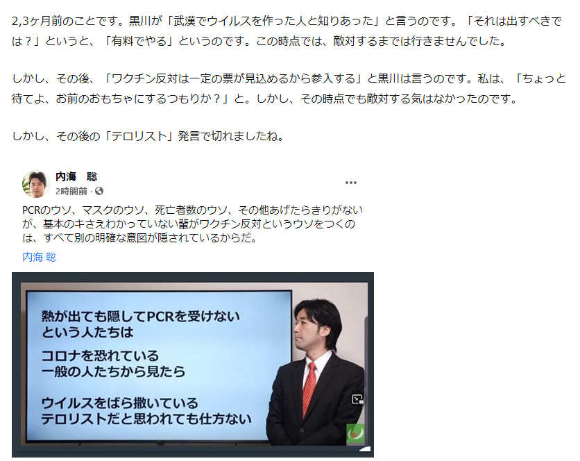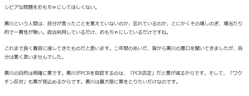 さて、この黒川が「反ワクチンを利用している、おもちゃにしている」との彼の意見は変わったのでしょうか?黒川から何らかの反省があったのでしょうか?それとも、「そんなことどうでもいい」ということなのでしょうか?一切合切が不明です。