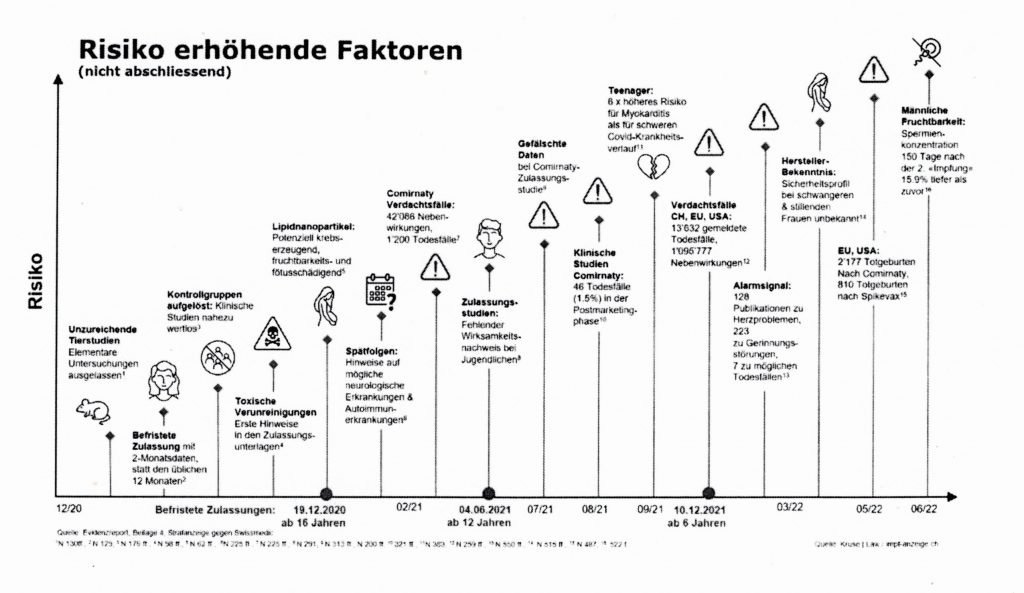 この自信は、スイスの弁護士クルース・ローが裁判所に提出した法的供述書に含まれる、2020年12月以降の「ワクチン」に関連するリスク要因の出現を特定の時間軸で詳述した表によって打ち砕かれた。(以下、ドイツ語から翻訳した要因)。