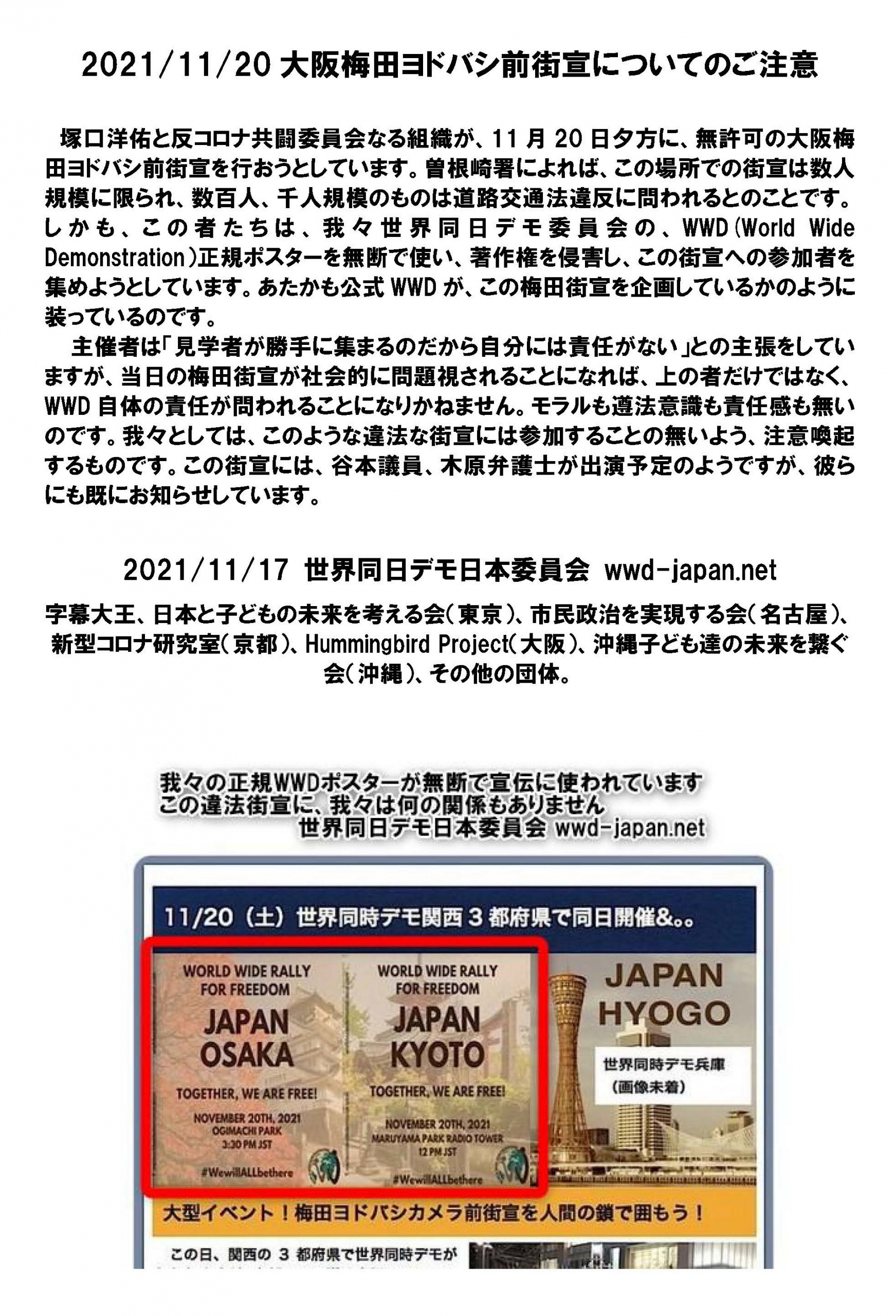 同様の盗みをしていたのが、現在の日本での世界デモを仕切っている塚口洋祐です。塚口は、我々の世界デモの成功を見て、それを欲し、何とか入り込もうとし、我々の世界デモポスターを無断で勝手に使い、違法な大阪梅田街宣を企画しました。