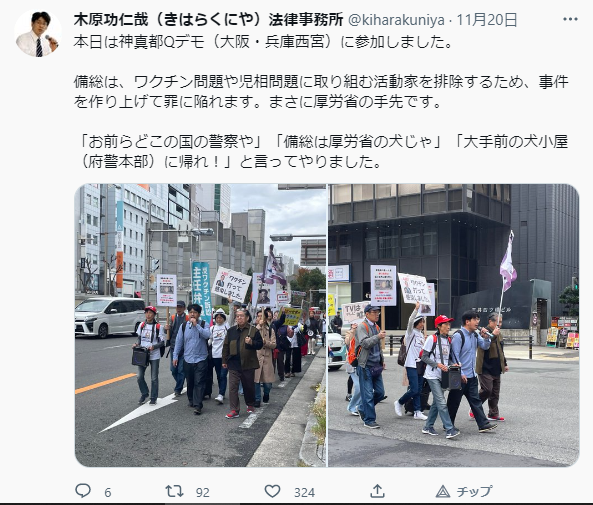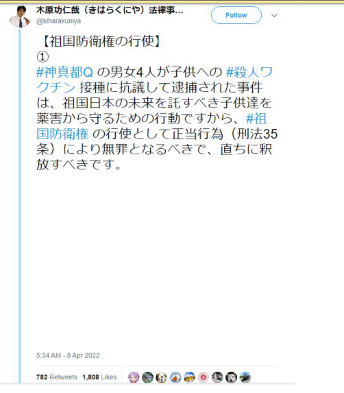 しかし、その後の4月に、ヤマトQは接種会場に侵入し、4人が逮捕されるという事件が起きました。これを、「祖国防衛権の行使だ」と言って、いちはやく擁護したのが木原くにや弁護士です。