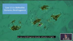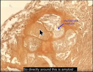 ブルクハルト教授は、電子顕微鏡を使って、この物質の研究をさらに進める予定です。これは、確かに複屈折(birefringence)を示します。興味深いことに、純粋なコレステロールの結晶が、この物質の中に埋め込まれていることが多いのです。彼は、これがアミロイド蛋白質であると考えています。