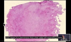 この謎の塊(clot)をスライスしたものは、こうです。ブルクハルト教授は、これが自己組織化するタンパク質で構成されているという印象を持ちました。