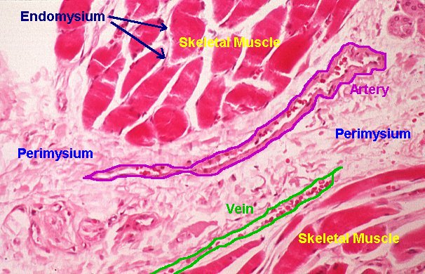 赤い部分には筋繊維の束があります。赤い部分の端にある、かろうじて見える(目を凝らさないと見えない)青や紫の細長い部分は、筋細胞という細胞の核です。これらの細胞は、筋肉を構成する繊維を合成します。