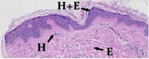 組織学的な分析では、細胞や組織のさまざまな部分を人工的に着色するための染色が行われます。よく使われる染色にH&Eがあります。Hはヘマトキシリンのことで、細胞の核を選択的に染める紫色の染料です。Eはエオシンという赤色の染料で、臓器のタンパク質を染めることができます。
