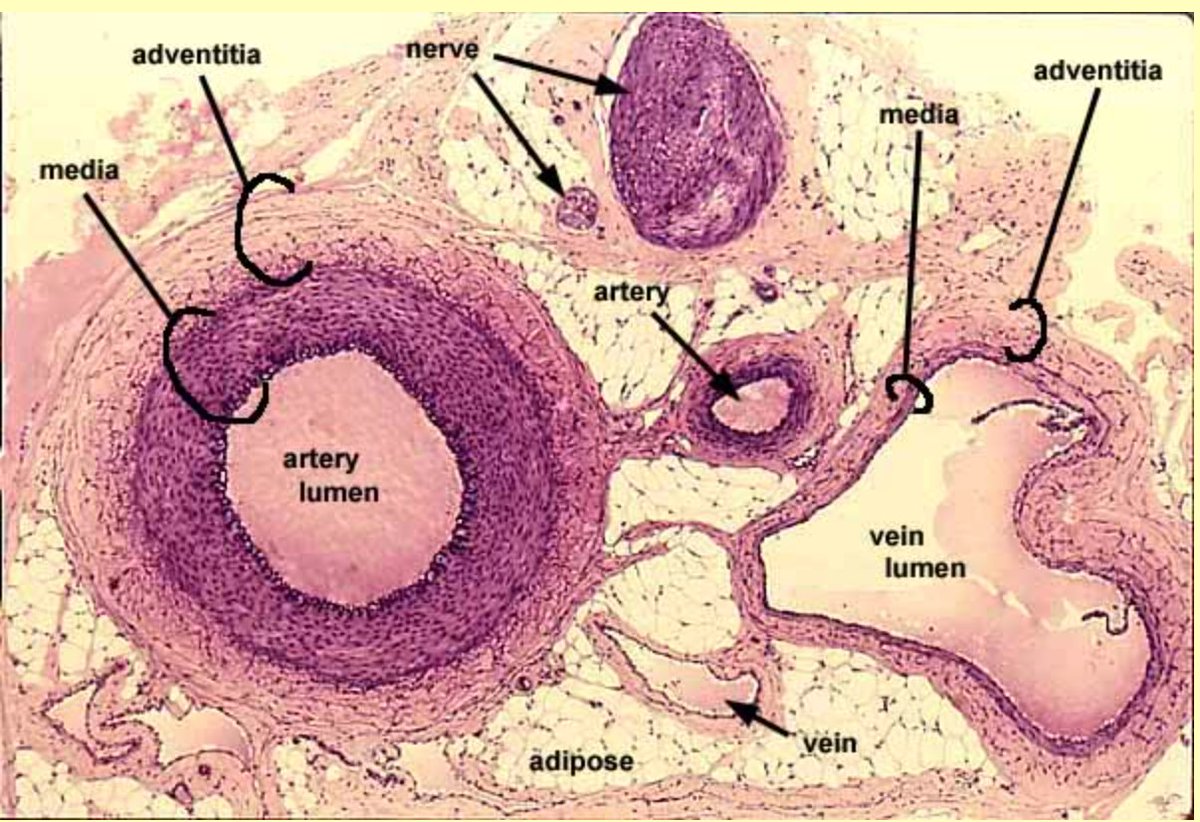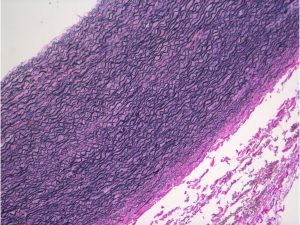 中膜は、筋細胞の核が見える厚い紫色の層です。内膜(濃い紫色)と外膜(薄いピンク色)に挟まれています。この3層が動脈壁を形成しています。