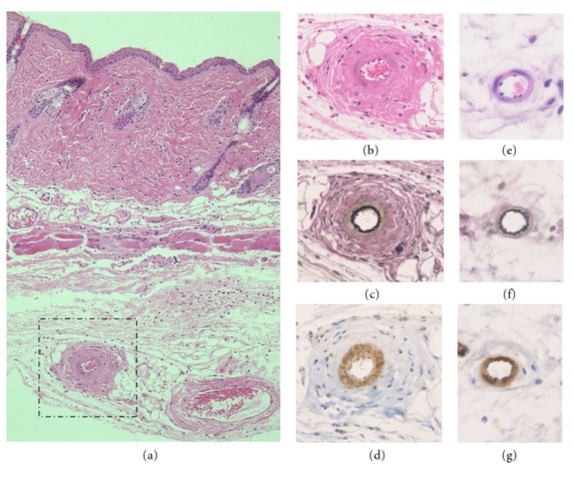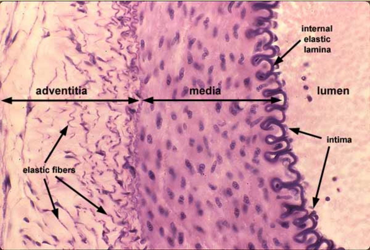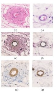 ブルクハルト教授の重要な発見のひとつは、血管の弾性繊維と筋肉の損傷です。血管の損傷に関する彼の議論を理解するためには、正常な状態と異常な状態で血管がどのように見えるかを知る必要があります。