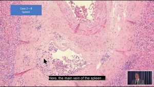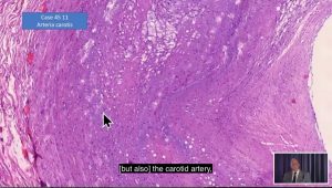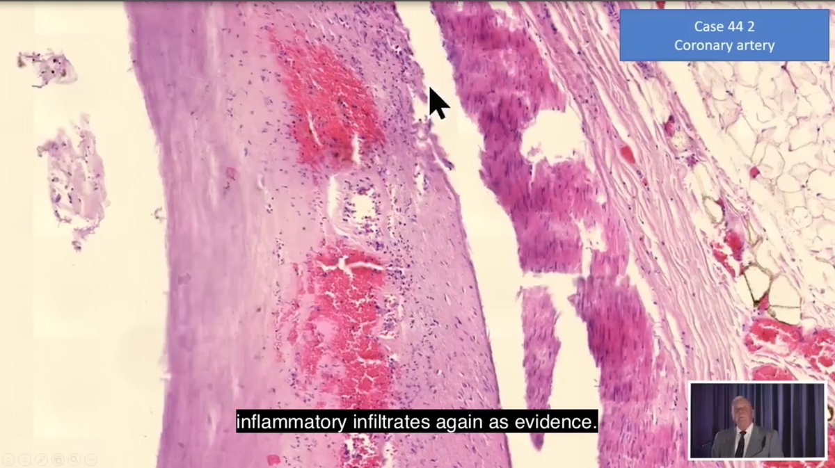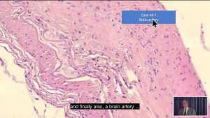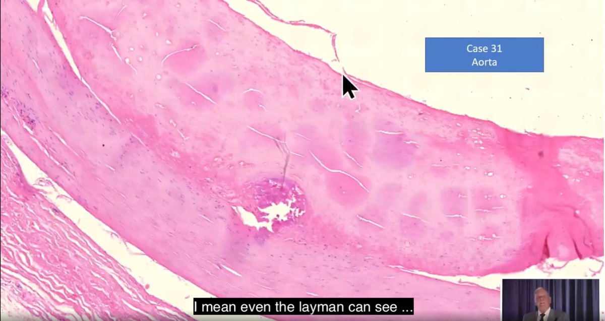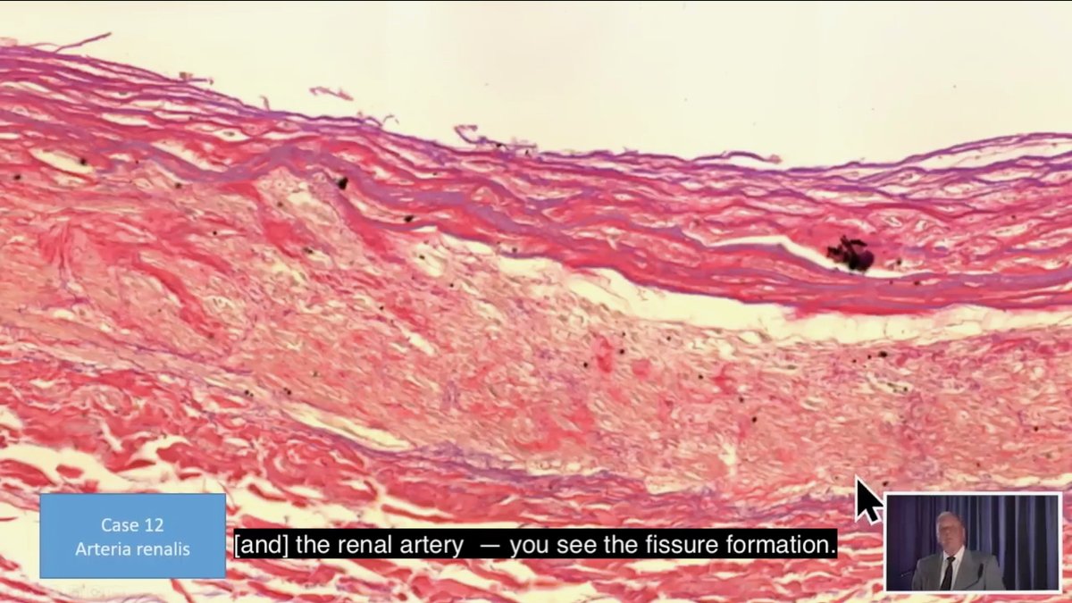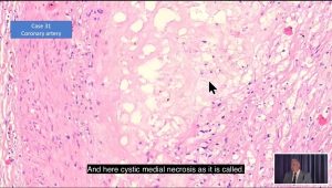 解剖と穿孔に加え(?)、動脈壁には筋肉と繊維の破壊を示す白い部分があり、これはCystic Medial Necrosis(CMN)と呼ばれる状態です。ブルクハルトが指摘するには、CMNには先天性のもあるが、リンパ球が浸潤していない状態であると言います。