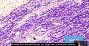 この(対照とした)正常な動脈壁の写真では、エラスチン繊維は切れ目なくきれいに組織化されています。これを、壁のエラスチン繊維の損傷を強調する症例46の動脈壁の詳細なクローズアップと比較してみます。