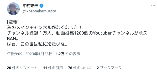 その中村浩三氏のYouTubeチャンネルが削除されたそうです。本人の弁としてはこうです。