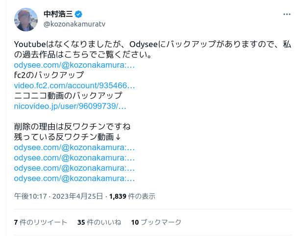 しかし、他のおバカさん達と異なり、彼はある程度、Odyseeにバックアップしていたそうです。そして、削除の理由は反ワクチンだろうと。