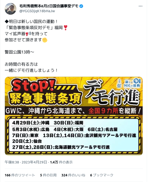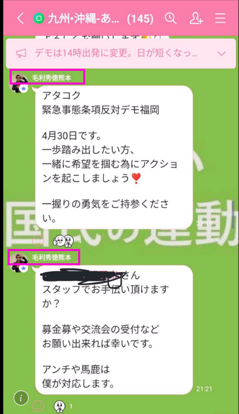 しかし、実際に毛利のやっていることといえば、黒川主導の「新しい国民の運動(アタコク)」のSTOP緊急事態条項デモの中心メンバーであり、4月30日福岡、5月3日広島のデモの担当者です。これではとてもスパイではなく、主体的な黒川協力者と断言できます。