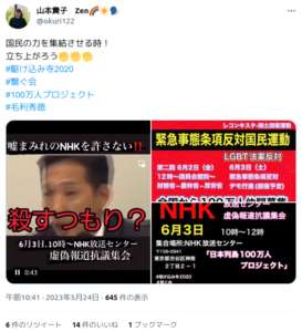 その「日本列島100万人プロジェクト」で「ワクチン打ったヤツ全員馬鹿」などと歌う出演者で盛り上がったり、NHKへの抗議活動などを通じてコロナワクチン被害者遺族を巻き込もうとしているのがZENの山本貴子です。この構図を知っていたら誰でも、コロナワクチン被害者遺族の活動に支障をきたすリスクが高いと危惧することでしょう。