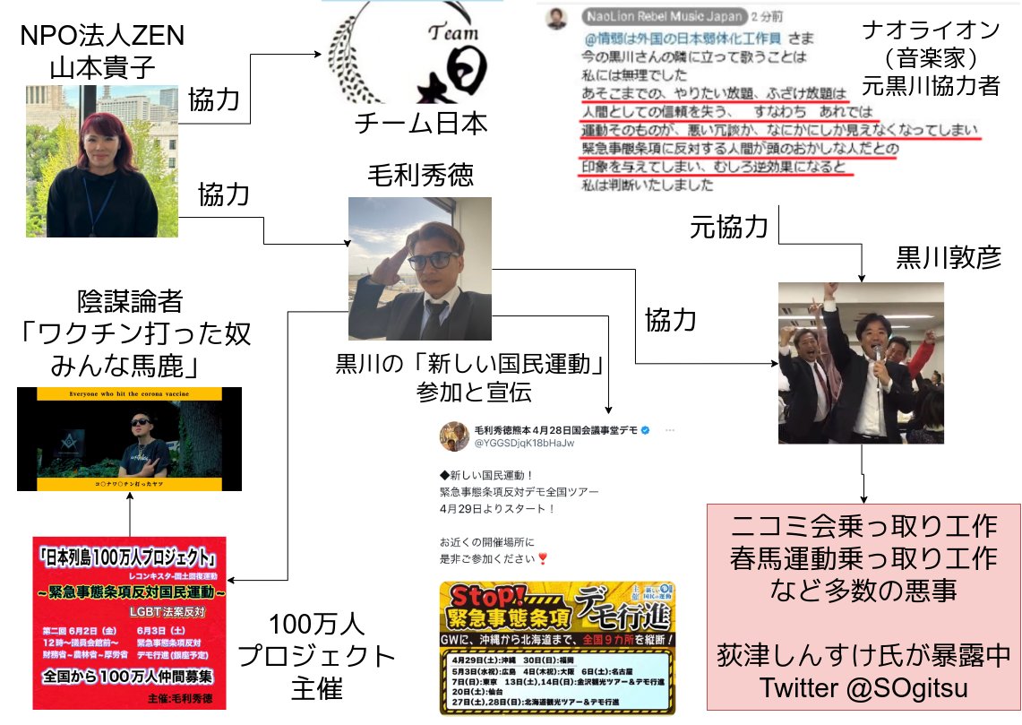 毛利主催の「日本列島100万人プロジェクト」は、ZENの山本貴子の発案で始まっており、4月29日に緊急事態条項反対の国民運動と称し厚労省前で抗議活動を行いましたが、翌日の黒川主催のSTOP緊急事態条項デモを毛利が担当しているとは「日本列島100万人プロジェクト」の参加者は思いもよらないことでしょう。