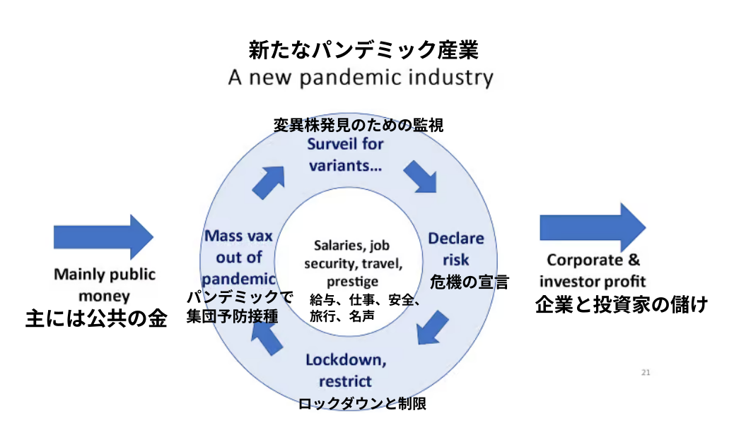COVID対策ではほとんどが利益を得られなかったが、利益を得た者、特にWHOの資金提供者であり、大規模な製薬会社やソフトウェア資産を持つ個人や企業の資金提供者は大きな利益を得た。WHO職員やグローバルヘルスに携わる人々もまた成功を収め、アジェンダの拡大つれ有利なキャリアを確保している。旧来のエビデンスに基づく公衆衛生は脇に追いやられ、ソフトウェア企業家や製薬会社の大物による新しい公衆衛生がキャリアを築くことになった