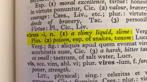 私が初めてウイルスという言葉の原義に出会った時は、こういった文章による説明ではなく、単に「ウイルスとは毒や毒素に相当する」というだけの、最大でも三文程度の短い定義だった。私はこの定義を初めて目にしたときのスクリーンショットを三日間無駄に探したが、ニ年以上前のことなので見つけられなかった。もし見つかったら、この記事を編集して追加するつもりだ。