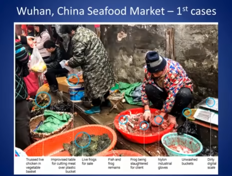 さて、行きましょう。最初から始めたいんです、グラウンド・ゼロです。中国湖北省の武漢です。これは海産物市場です、屋外のですね。そこで最初の事例が発生しました、この写真でご覧になるように、多くの肉、動物の死体が地面に置かれてます。
