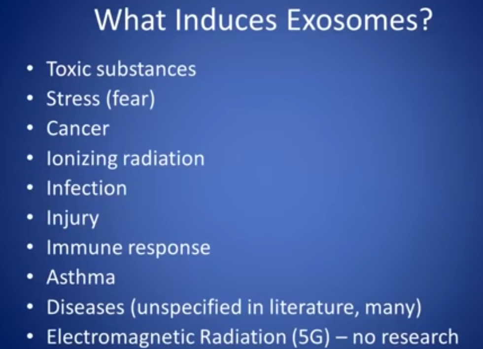 さて、多くの論文で言うことは、エクソソームは病気によって放出されるとありますが、具体的には何の言及も無いんです。しかし、この意味としては、実質的にすべての病気と思います、このプロセスを起こすのは。さて、私は本当に証拠を求めました、EMF(電磁場)がエクソソームを放出することのです。が、何の論文もありませんでした。しかし、言いたいんです、このエクソソーム研究の分野の方には、これは非常に重要な貢献になるだろうと、この問題を見ていただければですね。もし、特に5Gのような様々なマイクロ波放射もまた、これを引き起こすとなればですね。