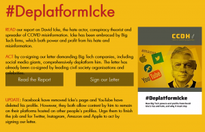 で、CCDHというのはCenter for Countering Digital Hate(デジタルヘイト反対センター)の略なんですが、ウェブサイト見てみると。。。対象はデービッド・アイクだけじゃん。。。