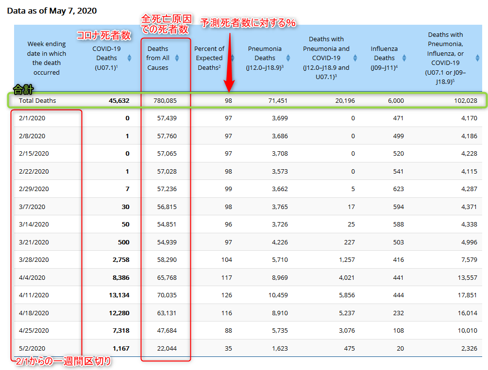 2/1から5/7までの全死亡原因での合計死者数は、予測死者数の98%になってます。つまり減少しており、約16,000人の命が助かっている計算です。