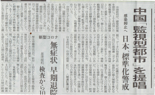 要するにですね、コロナを食い止めた中国の個人行動監視モデルを国際標準としてISOに提案するんだそうです。こうです、「関係筋によると、中国の国家標準化管理委員会が4月下旬、ビッグデータを活用して感染症対策をすすめる都市行政の仕組みとしてISOに提案したという。個人の行動データを慈善に把握できる体制を構築し、AIやビッグデータ技術で解析することなどを想定している模様だ」。