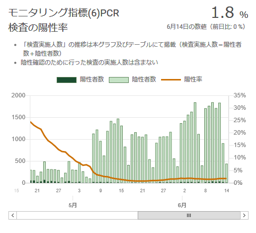 例えば、東京都の場合には5/7以降検査数が急増しているのに、感染者数はそれほど増えていません。都内の最新感染動向より。
