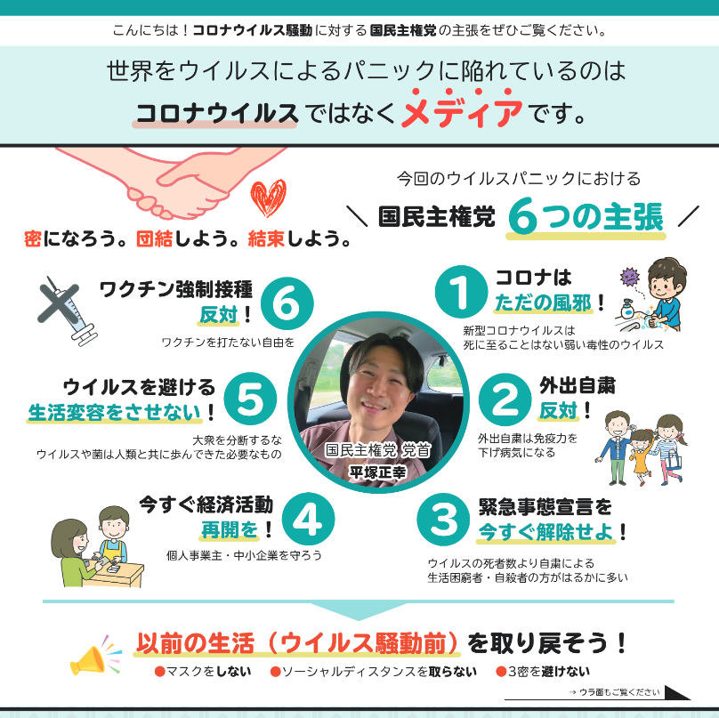 世界をパニックに陥れてるのはコロナではなくメディアです 未分類 2020.06.19 良く見てみると、国民主権党がこんなチラシを出してましたね。 A4裏表用のPDFがこちらからダウンロードできます。 しかしこのポスターも欲しいのだけど、法律で駄目なんですかね?このインパクトはすごい。平塚よ、君はまさにヒーローだ。