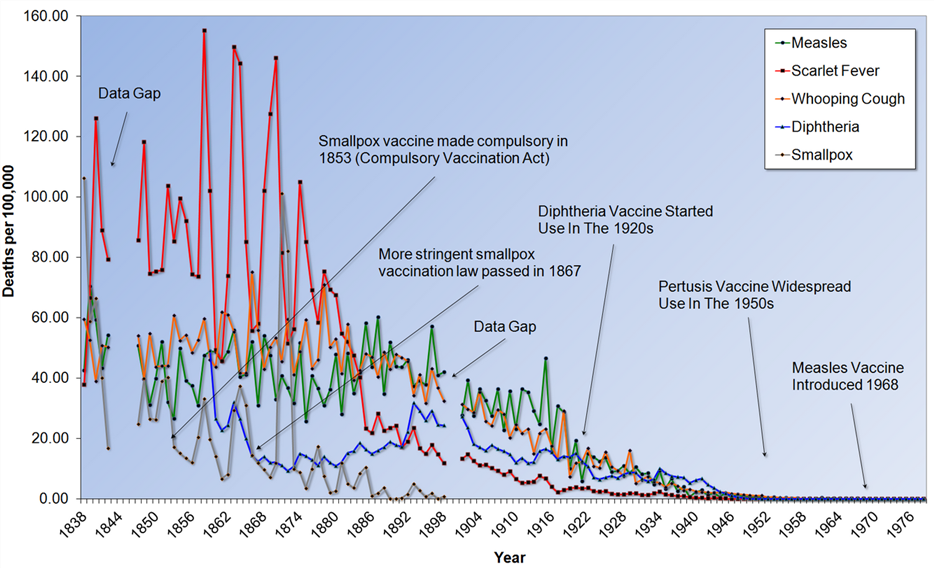「ワクチンが現れたおかげで、あらゆる病気が根絶された」というのは全くの嘘です。これはアンドリュー・カウフマンも言ってますが、彼が言及しているグラフはスザンヌ・ハンフリーズのものですね。